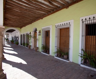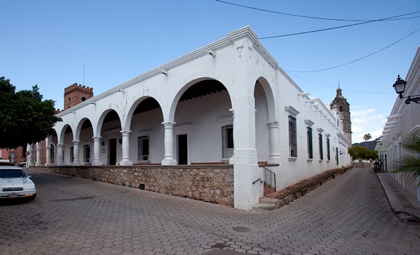 Callé Juárez #6 is the Hotel Los Portales, a portion of the home built by Don José María Almada in the early years of the19th Century. Don José, owner of the two richest mines in northern Mexico, had 19 children with his first wife, Isabela; after her death in the 1840s, he had 14 more children with his second wife. The property fell into ruin until 1947 when Levant Alcorn, an American visiting this city, purchased the property and started the “Álamos Revival” which continutes to this day.
