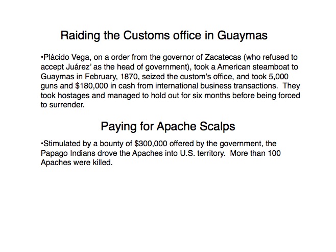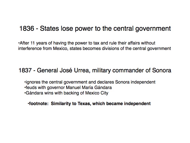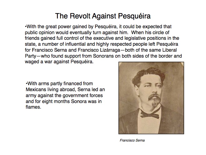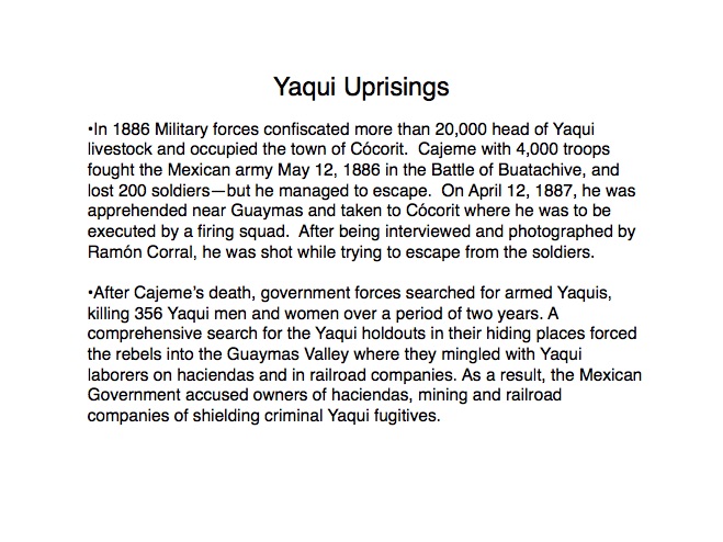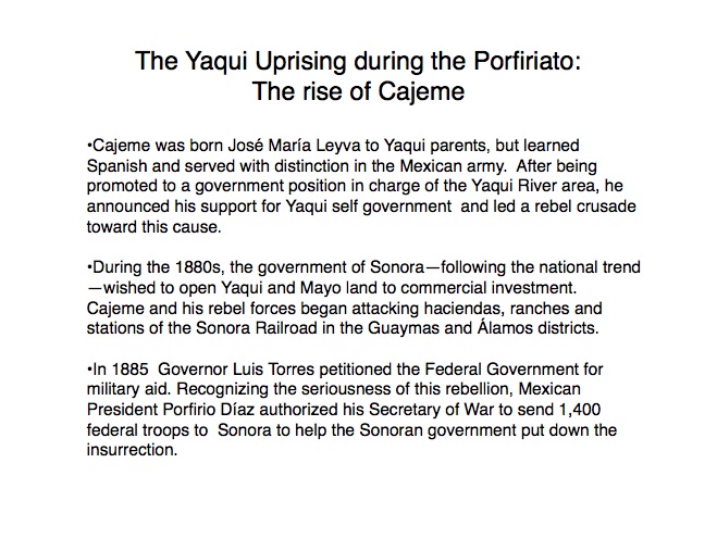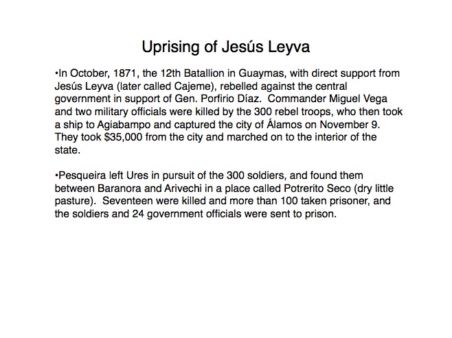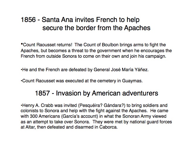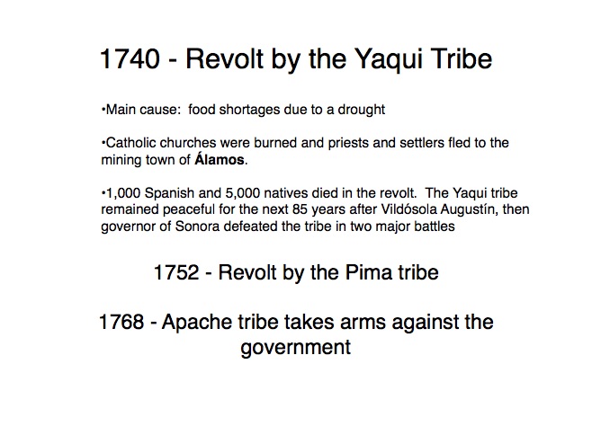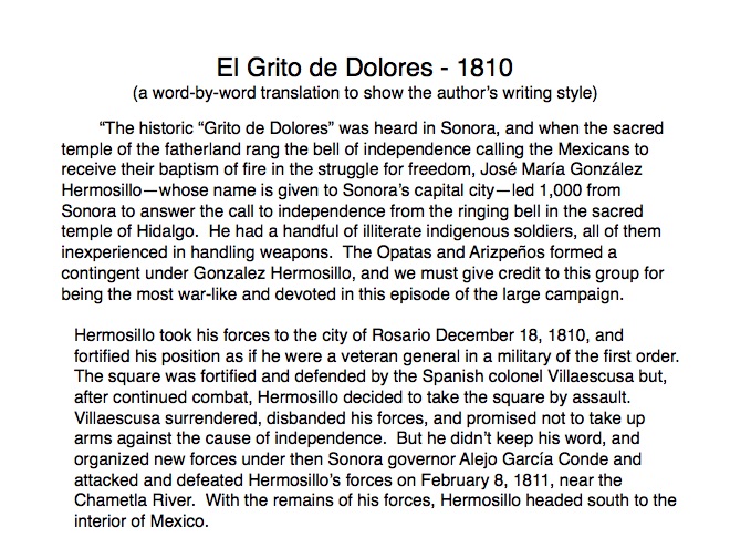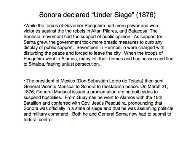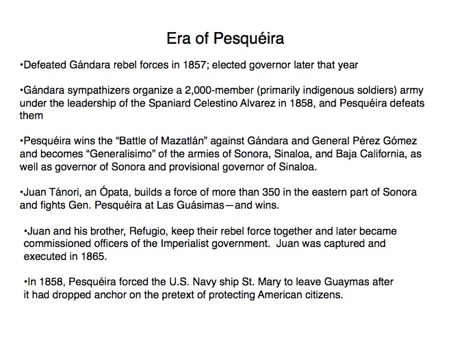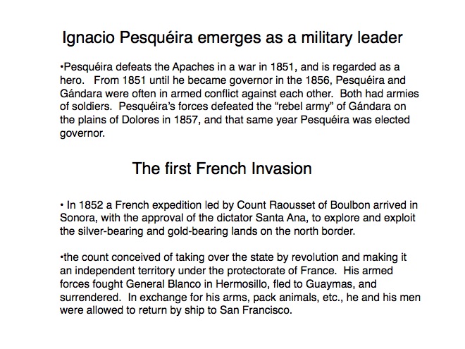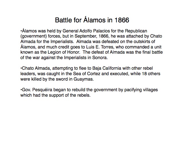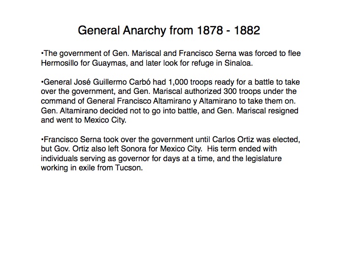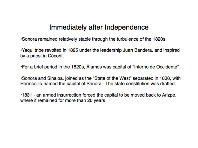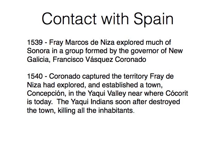 The indigenous tribes of Sonora first made contact with the Spanish in the 1530s when Nuño Beltrán de Guzman arrived in 1531, followed by the explorer Fray Marcos de Niza in 1539. Francisco Vásquez de Coronado “captured” this territory in 1540 and established a town near where Cócorit is today, although that town was destroyed by the Yaqui Indians soon after. Federico García y Alva documents Sonoran history from the Spanish intrusion through the turbulent 19th Century in a document commissioned by the government of Sonora in the late 1890s; while it is not an unbiased historical document, it provides an excellent insight into the struggles for political power in Sonora after Mexico’s independence from Spain in 1821. “Sonora Histórico” can be read in Spanish on-line at http://www.historiadehermosillo.com/htdocs/historiadesonora/sonorahistorico.htm, and the English translation will soon appear on this website.